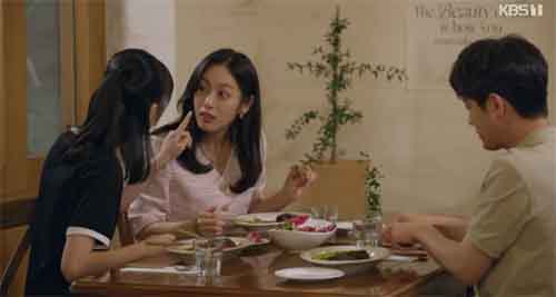 미래는 하필 식당에서 선주와 잔디, 강산 세 식구가 함께 식사하고 있는 장면을 보게 되고 표정이 어두워진다.